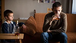 Мужчина пьет алкоголь, а ребенок рядом грустно на него смотрит